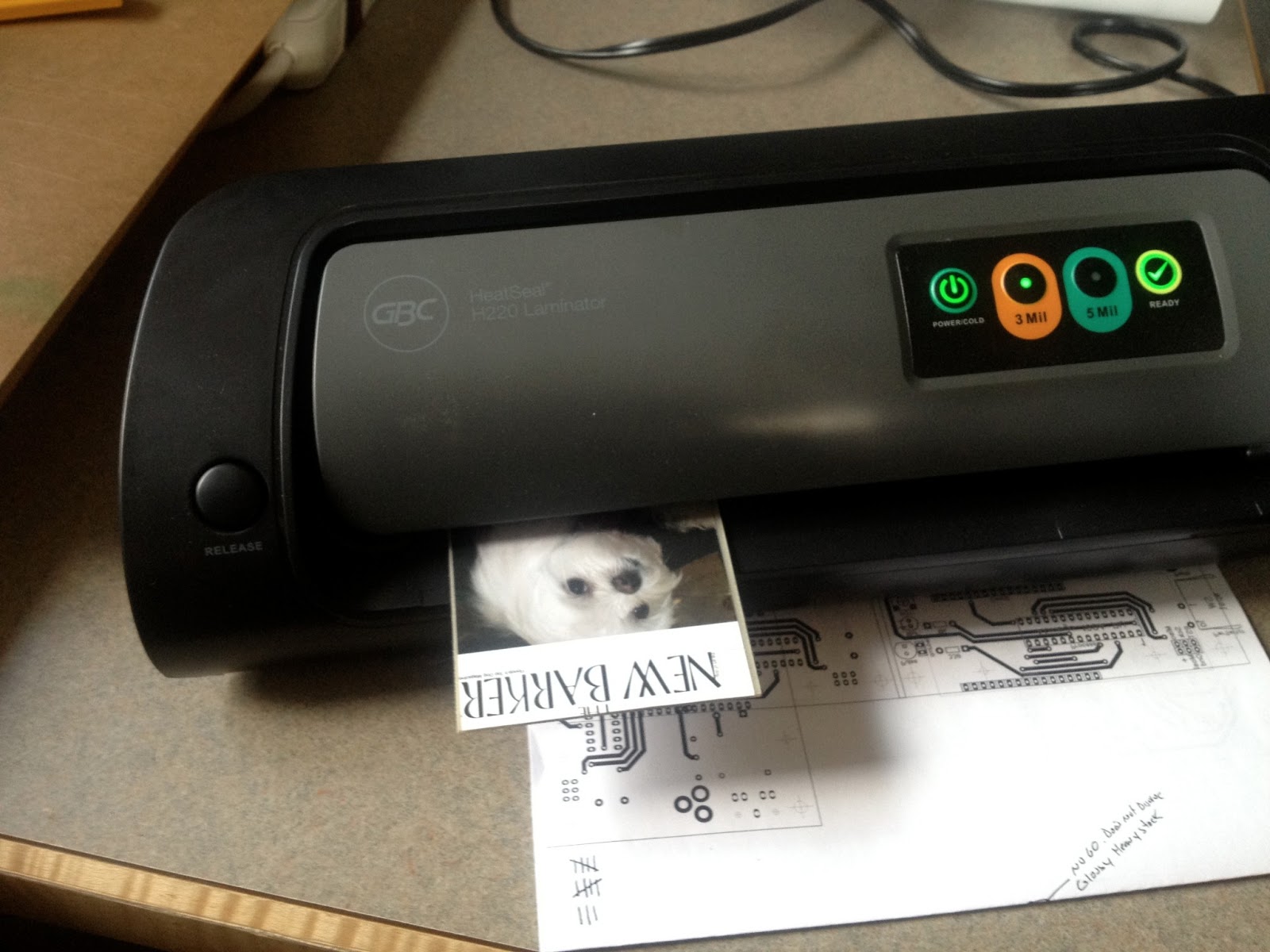 The laminator has been modded to feed about 1/2 of the speed it normally would. Its a very easy mod.